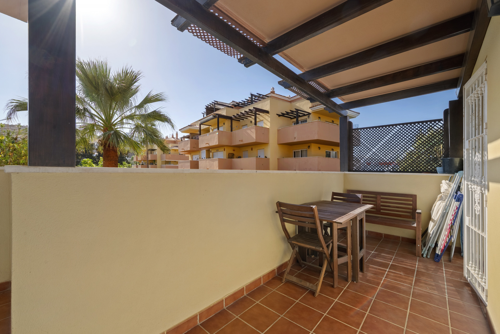 The accommodation is thoughtfully arranged to maximise both functionality and enjoyment of the surroundings. The separate, fully fitted kitchen comes equipped with modern appliances and is complemented by a dedicated laundry room. The spacious living room serves as the heart of the home, seamlessly connecting to the private terrace, which boasts pleasant views over the landscaped communal gardens, inviting pool area, and the neighbouring golf course. Both bedrooms offer direct access to the terrace, with the master bedroom featuring an en-suite bathroom, while the second bedroom is currently arranged as a study. A second, well-appointed bathroom completes the interior layout.