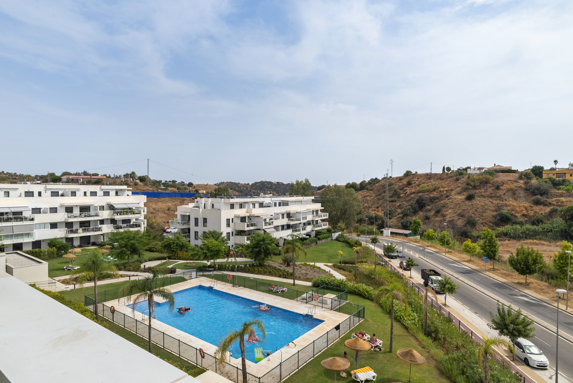 Residents benefit from a range of communal amenities, including landscaped gardens, a swimming pool, and a secure gated environment with lift access. The penthouse includes a private parking space within the communal parking area, providing convenience and peace of mind. The private terrace offers ample space for outdoor dining and relaxation, with both uncovered and covered areas, as well as views over the pool and surrounding countryside.