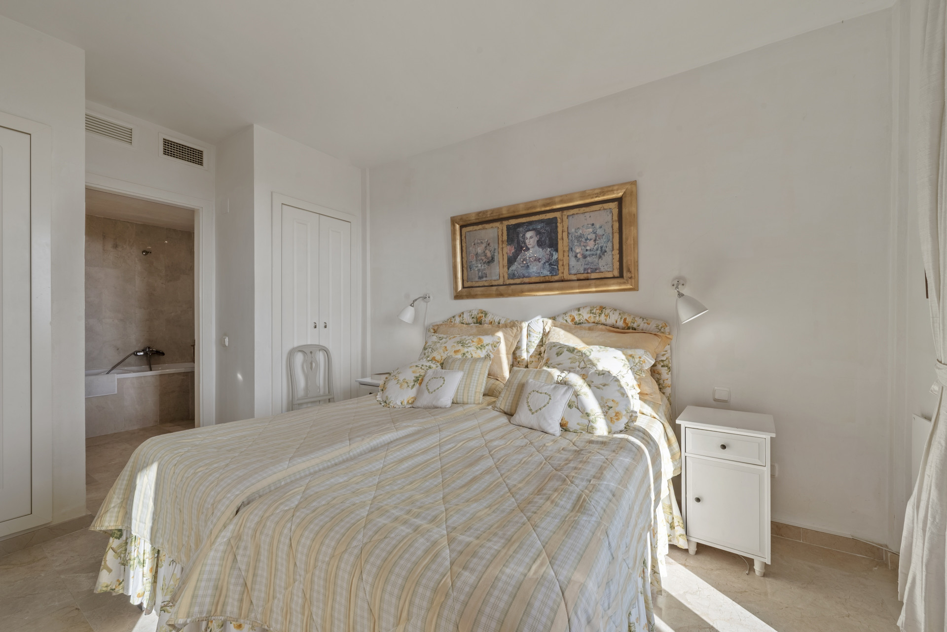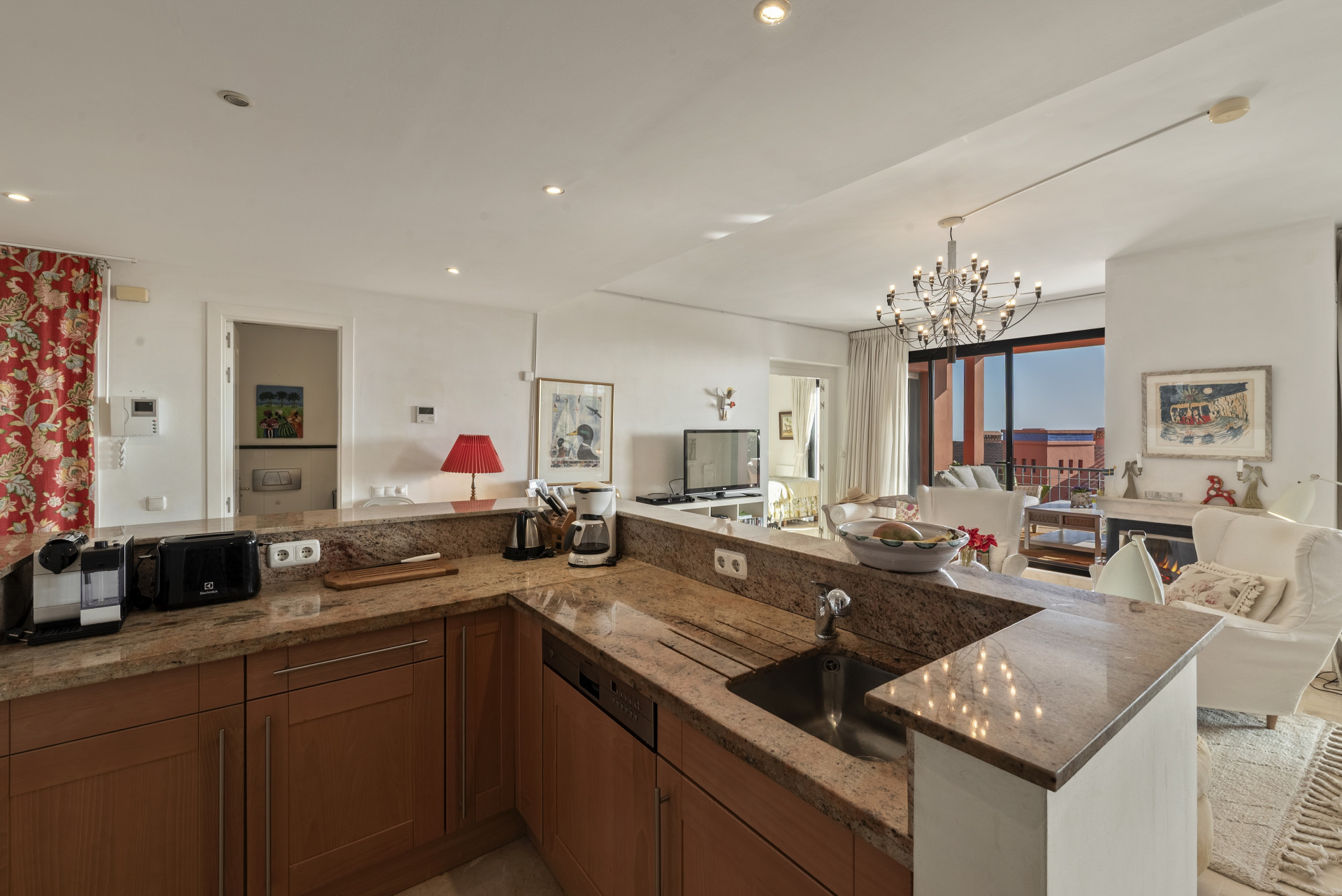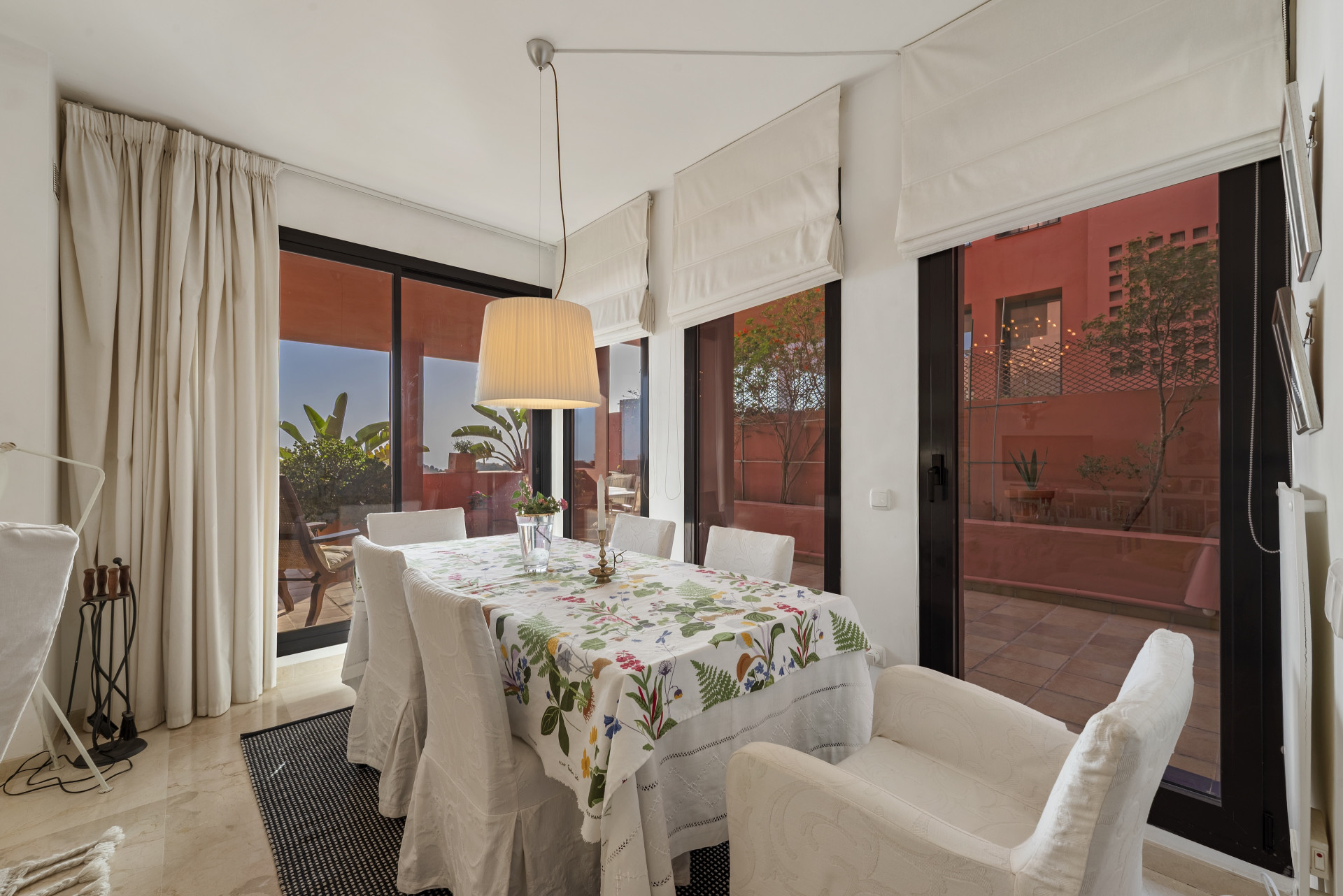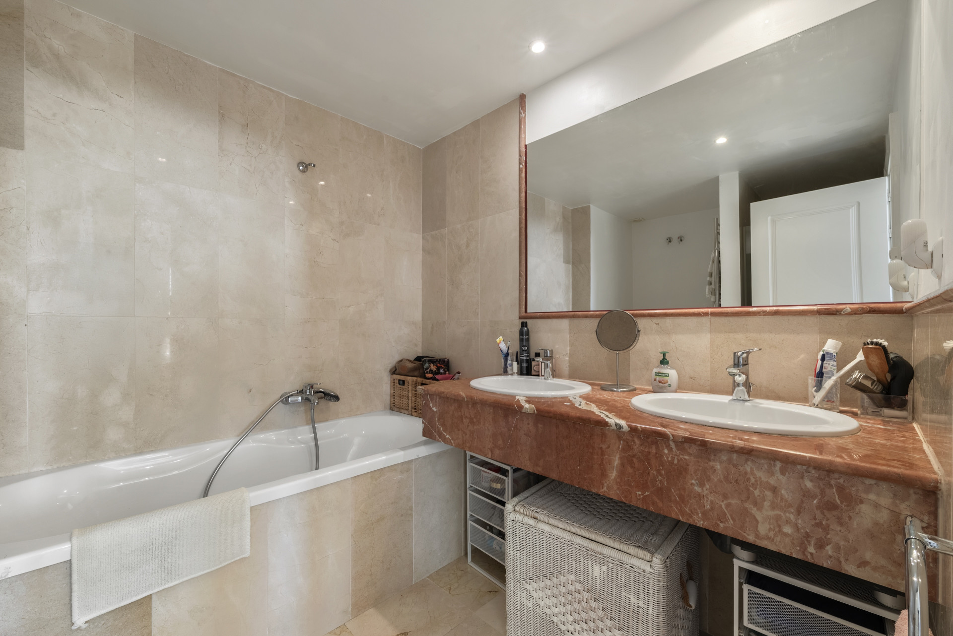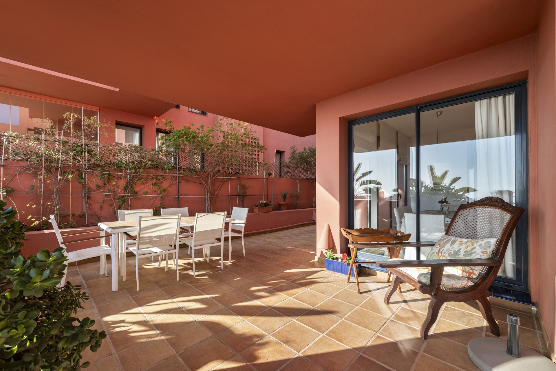 The apartment boasts a generous total area of 179.98m², with an interior space of 92.98m² complemented by an expansive wrap-around terrace measuring 87m². The layout comprises two spacious bedrooms, each featuring en-suite bathrooms for added privacy, as well as a guest WC. Both bedrooms and the living room provide direct access to the terrace, which is ideal for outdoor dining, relaxation, or entertaining, and offers partial sea views. The property is in excellent condition and benefits from optional furniture, allowing for immediate occupation or personalisation.